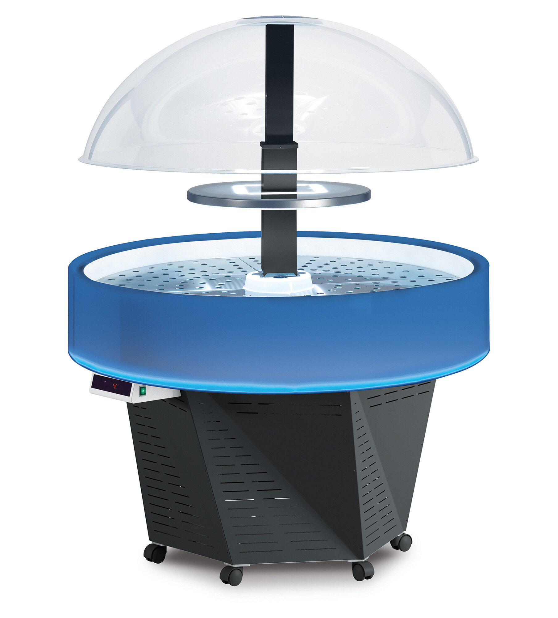 Холодильная витрина Scaiola Isola Evo Led New в аренду, купольная, среднетемпературная +3 +10 градусов, круглый корпус имеет цветную подсветку которая может меняться автоматически или дистанционно, а также можно установить удобный вам цвет из предустановленных в данной витрине. Ширина 1280 мм, глубина 1280 мм, высота 1680 мм.